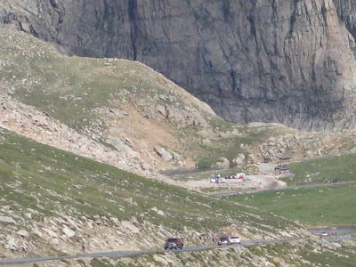 We had an aid station, the first and third of the day, waiting for us in the parking lot by Echo Lake Campground. The second aid station would be at the summit parking lot. Still some work to do before I could enjoy that one. I hadn't eaten, so I took advantage of the Hub Grub wagon operating near our aid station and had a breakfast taco and coffee. One of the volunteers was keeping a count of all riders who were heading up Evans so CRMBT could pay the $3.00 fee to use Mt Evans Road. I filled my water bottles, showed my wrist band and bike number to the ranger at the fee station, and headed up.